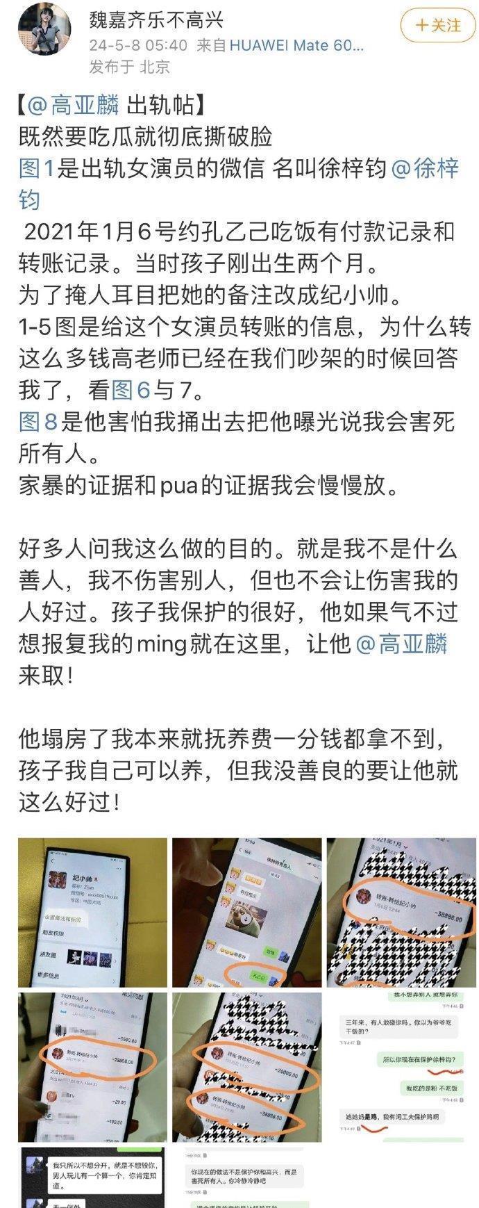 当天,魏嘉在社交账号上公开发文,称高亚麟不仅家暴自己,甚至还有过出轨的行为,为了证明自己的说法,她还晒出了一系列的证据。